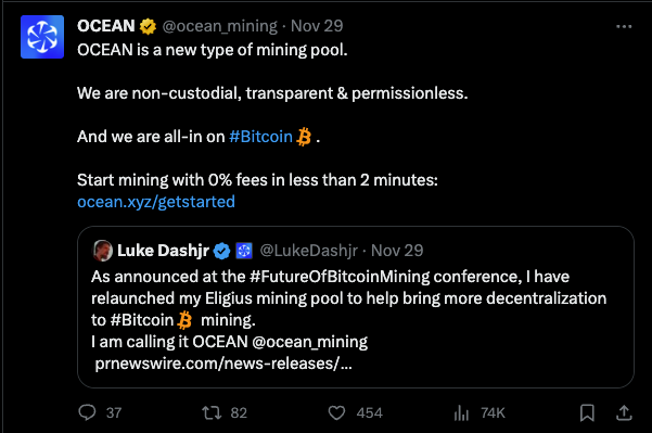 As announced late November, a new mining pool spearheaded by Luke Dashjr has gone online. Ocean is a non-custodial, non-KYC, permissionless Bitcoin mining pool.
