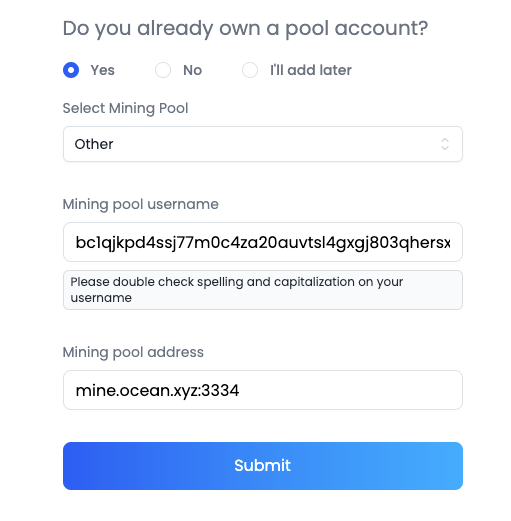 - Select mining pool "other" and enter mine.ocean.xyz:3334 for the mining pool address