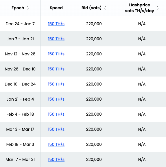 - View the total calculated hashprice (in TH/s/day) to place an informed bid!