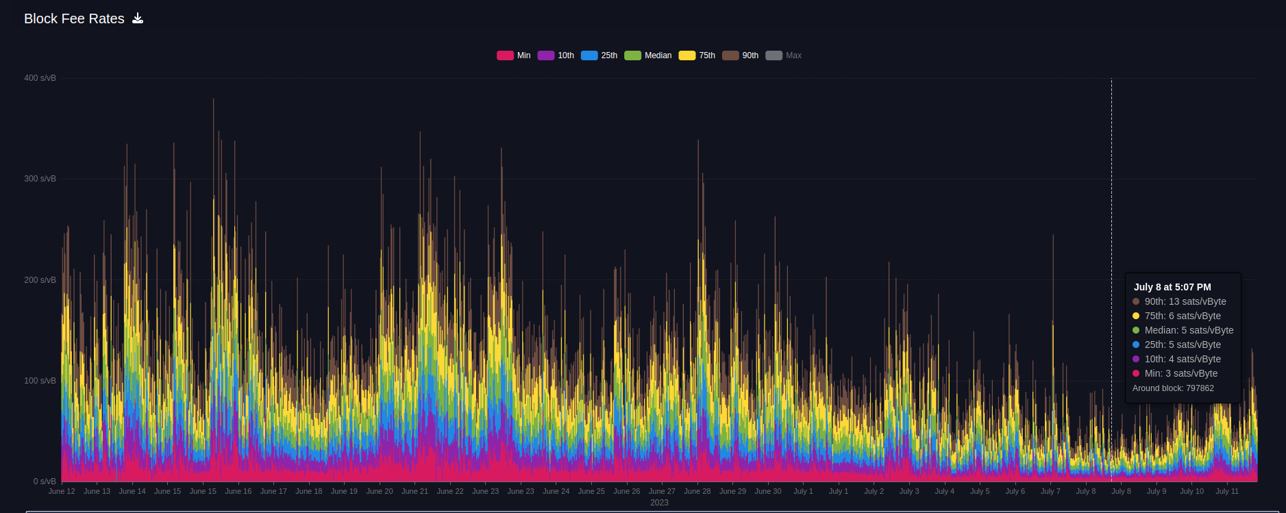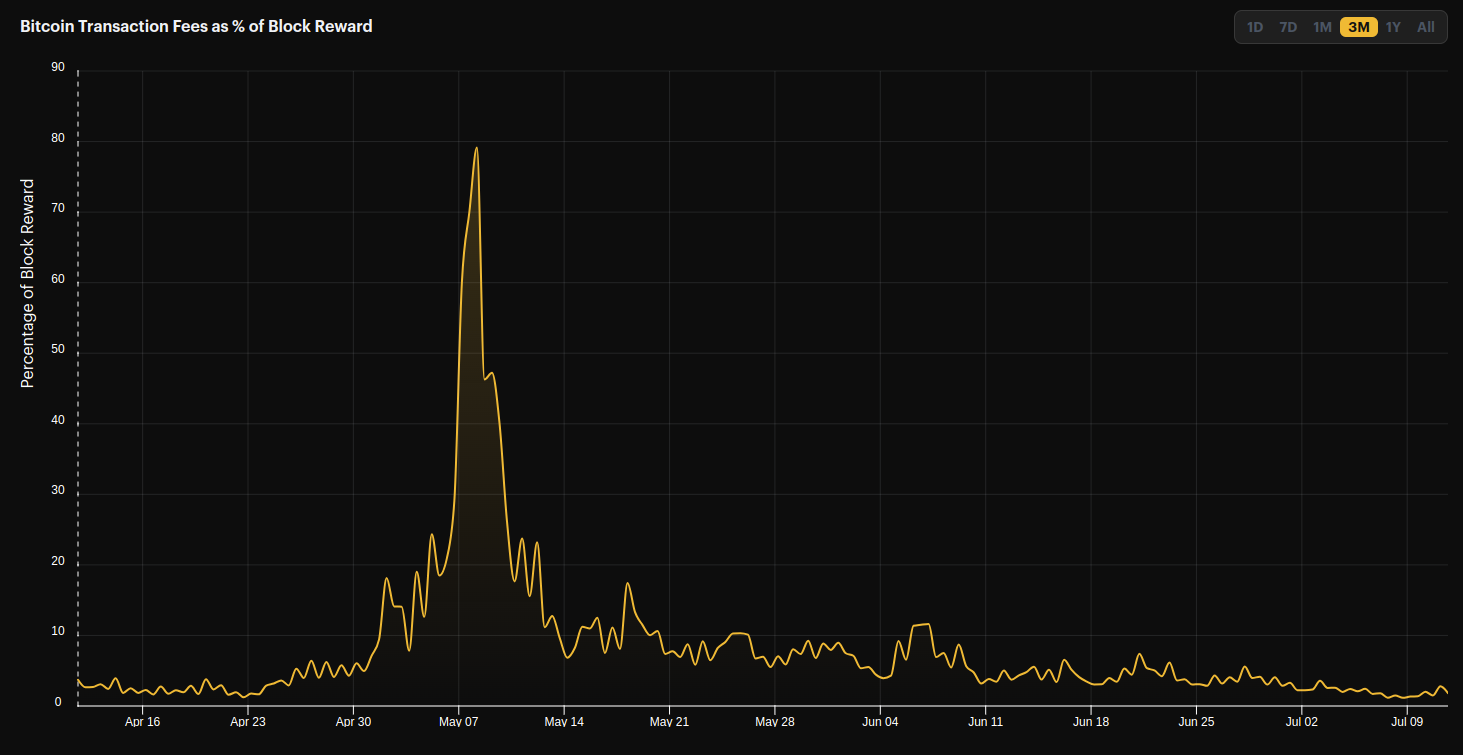 Over the last few months, we have been in a relatively high-fee environment with fees ranging from 79% (~360 sats/TH/s/day) of the block reward in May to around 5% (~13 sats/TH/s/day) last month.