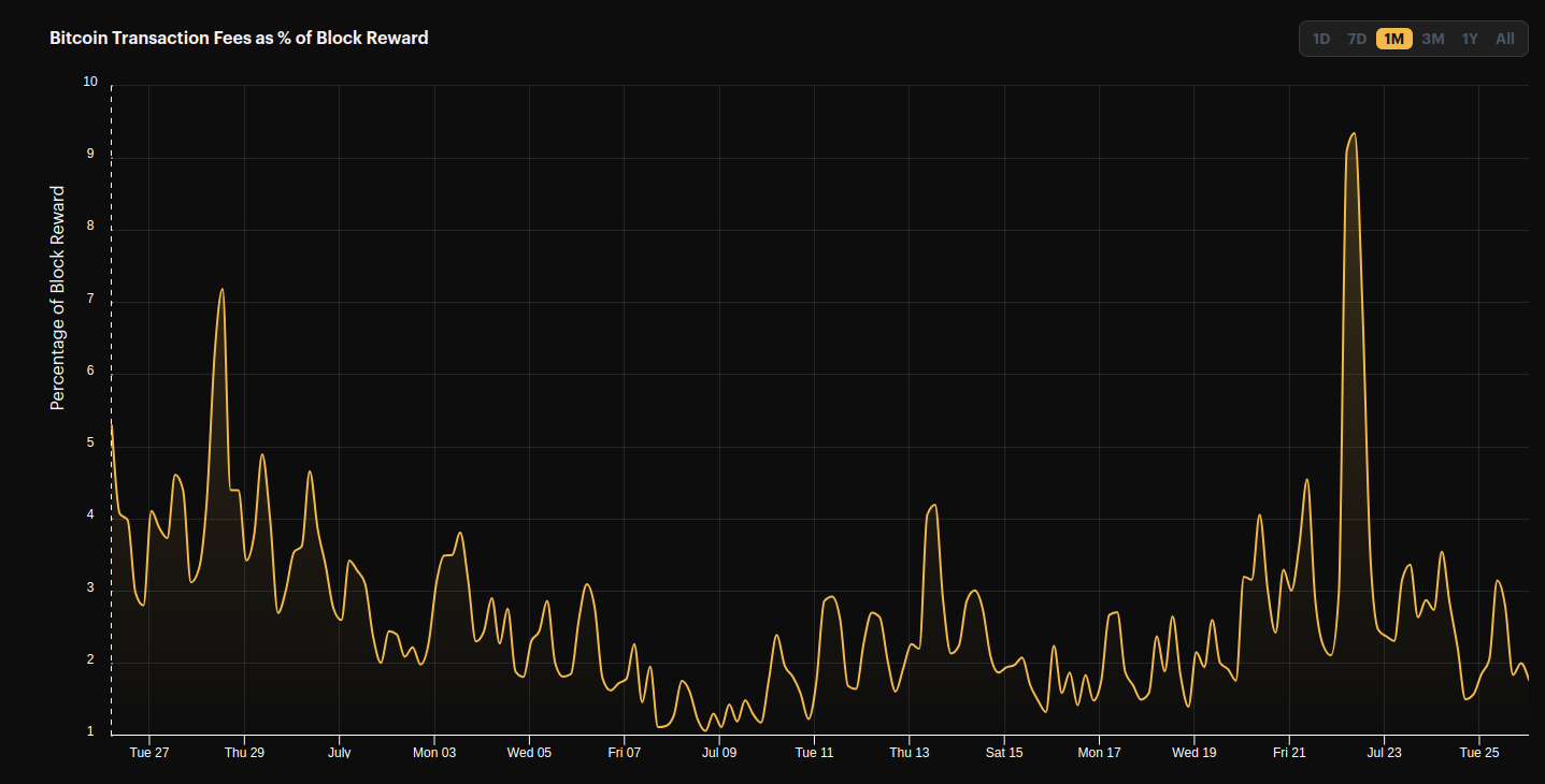 Fees this month ranged from 1% to 9% of the total block reward. In terms of hashprice, that's about 3 to 30 sats/TH/s/day from fees.