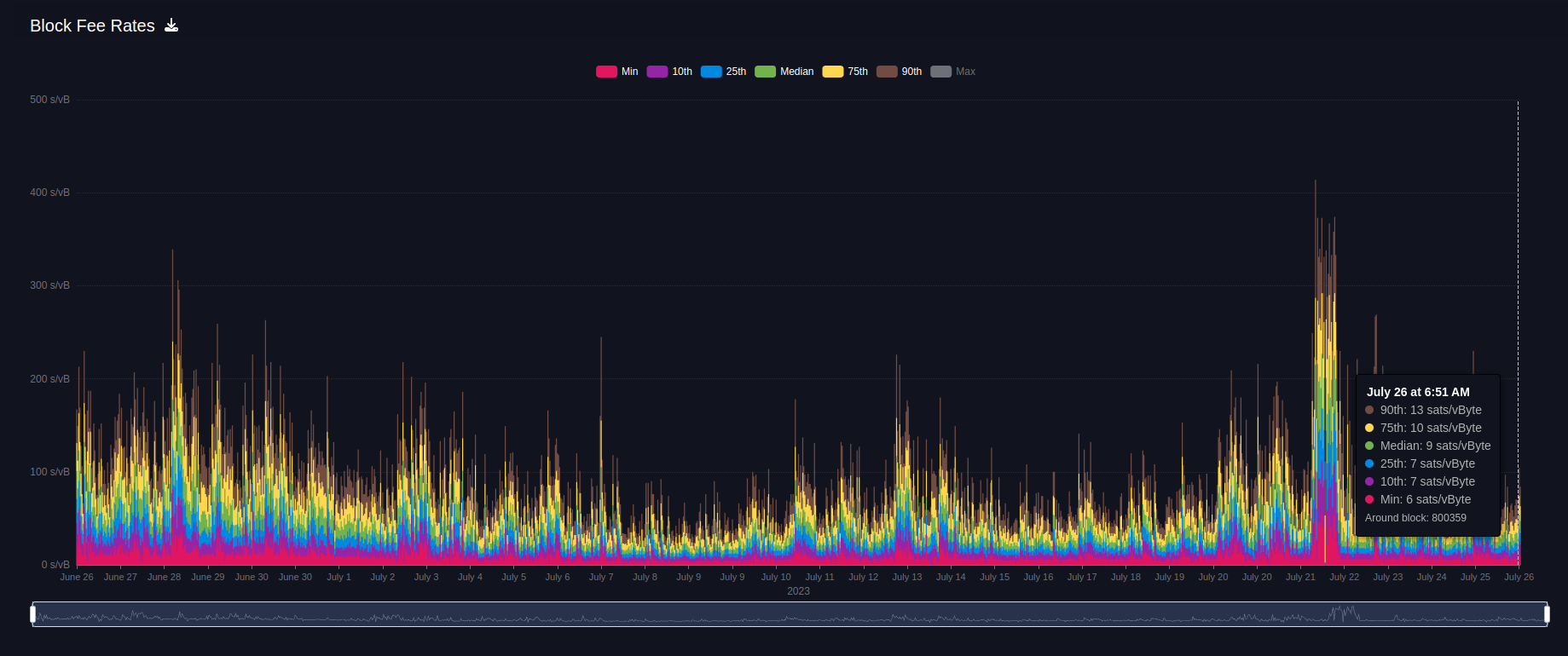 Due to some activity from the ordinals community, we saw a spike in fees around July 23rd.