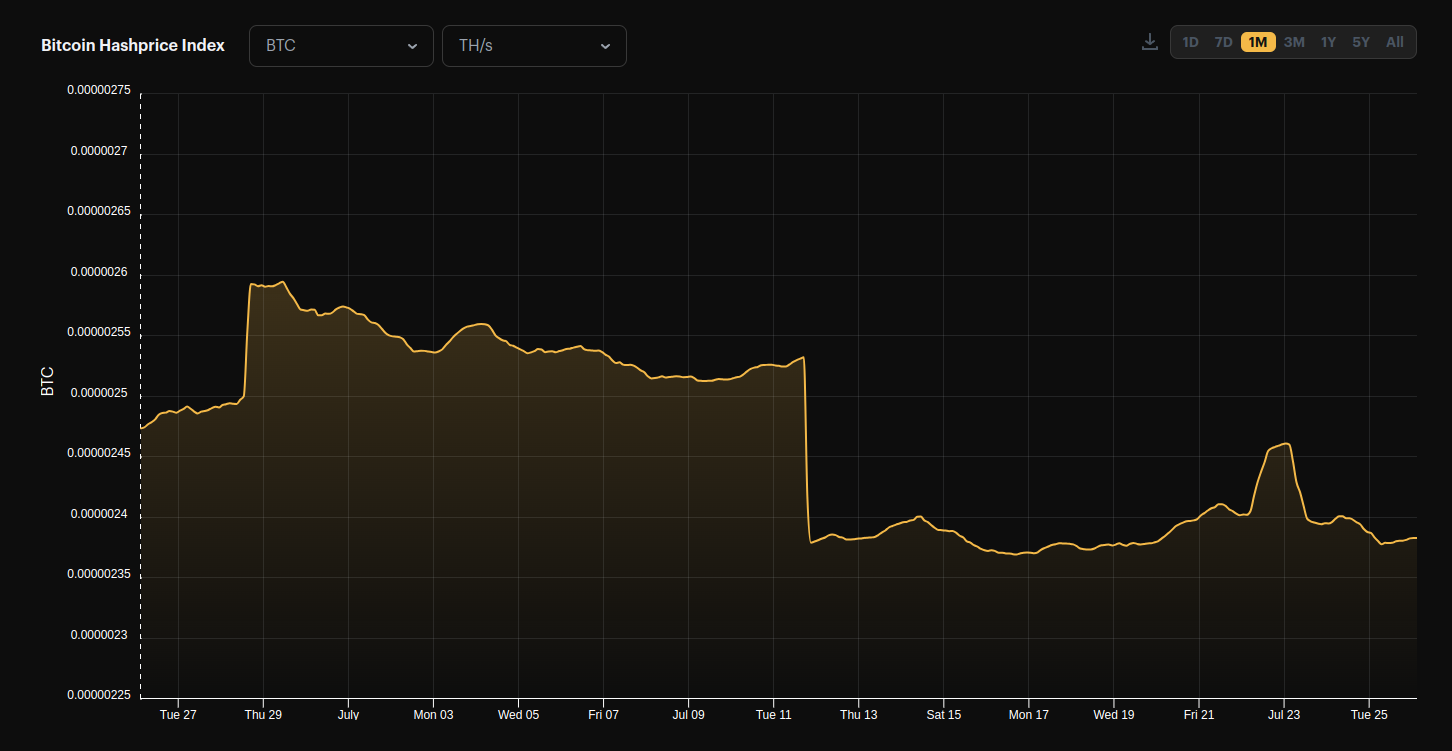 After the hashprice cliff from the previous upward adjustment of 6.45% on July 11th, we have now stabilized around 240 sats/TH/s/day. On July 23rd we saw a spike in transaction fees which is reflected in the chart below with a jump in hashprice to 246 sats/TH/s/day.