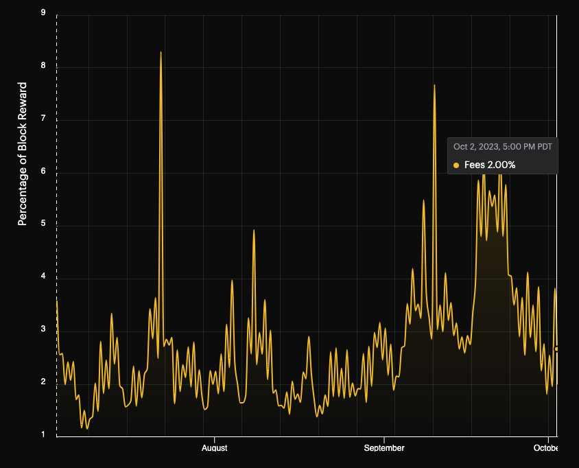 Oct 3rd fees were 2.00% of the block reward with a hashprice of 225 sats/TH/s/day