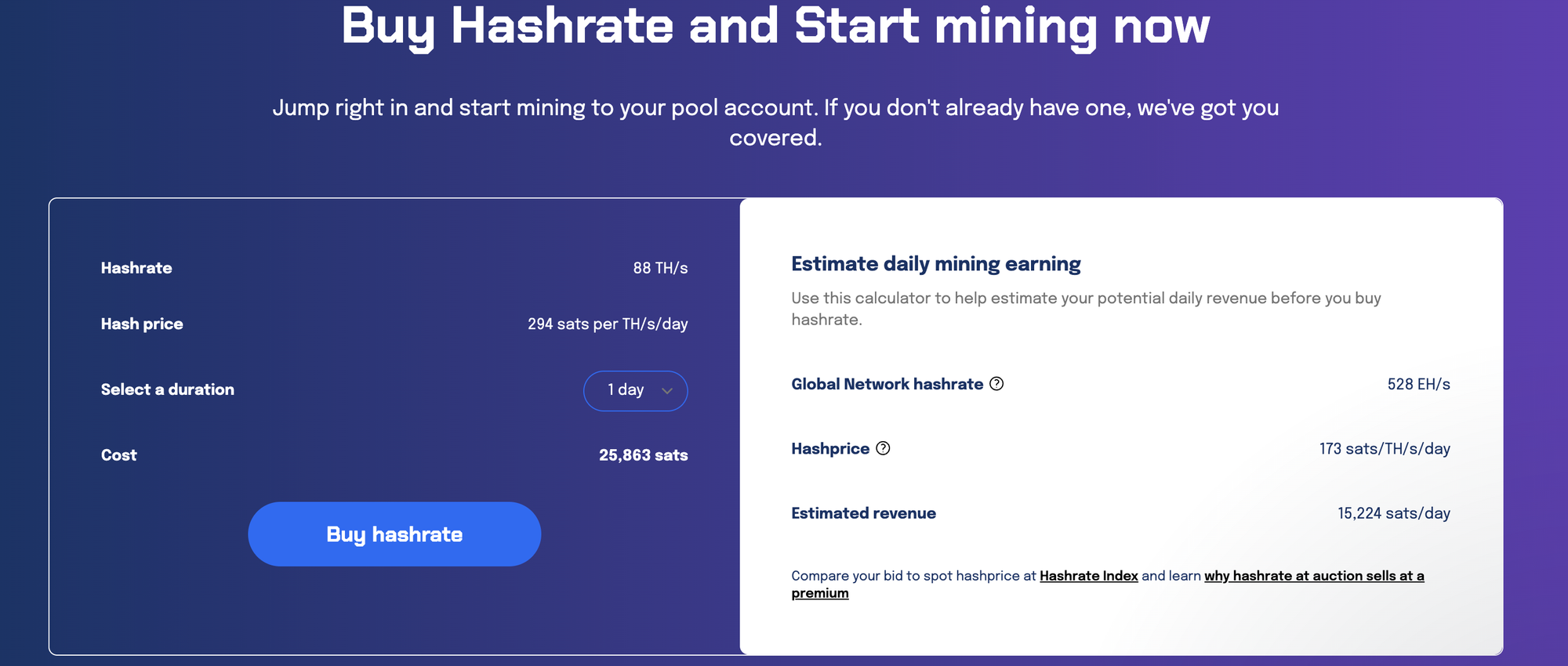 Select the drop-down menu for your desired duration of hashrate delivery, click Buy hashrate, pay the invoice (lightning recommended), and wait for the payment confirmation.