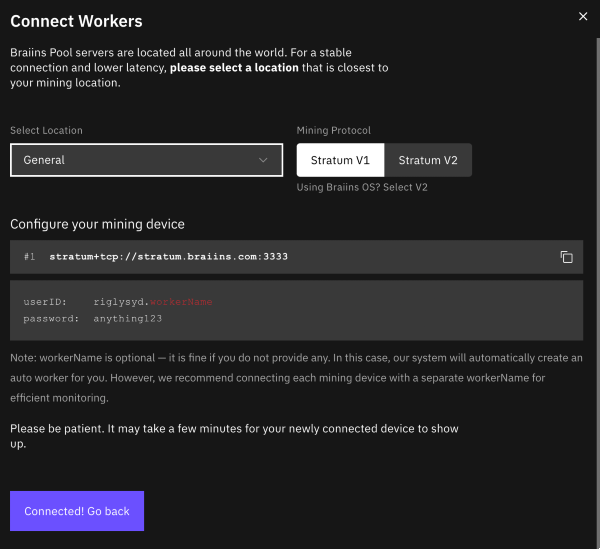 Select Braiins pool from the drop-down menu, and then type in your mining pool username: