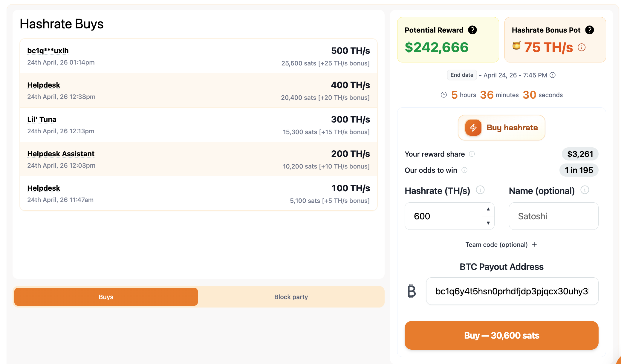 Plus: each buy earns bonus hashrate, improving the odds for all of us.