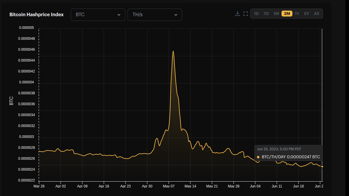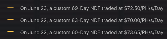 On June 23, spot hashprice was at $75.2/PH/s/Day, yet miners were still willing to sell their hash for $3 less in order to hedge against hashprice volatility.