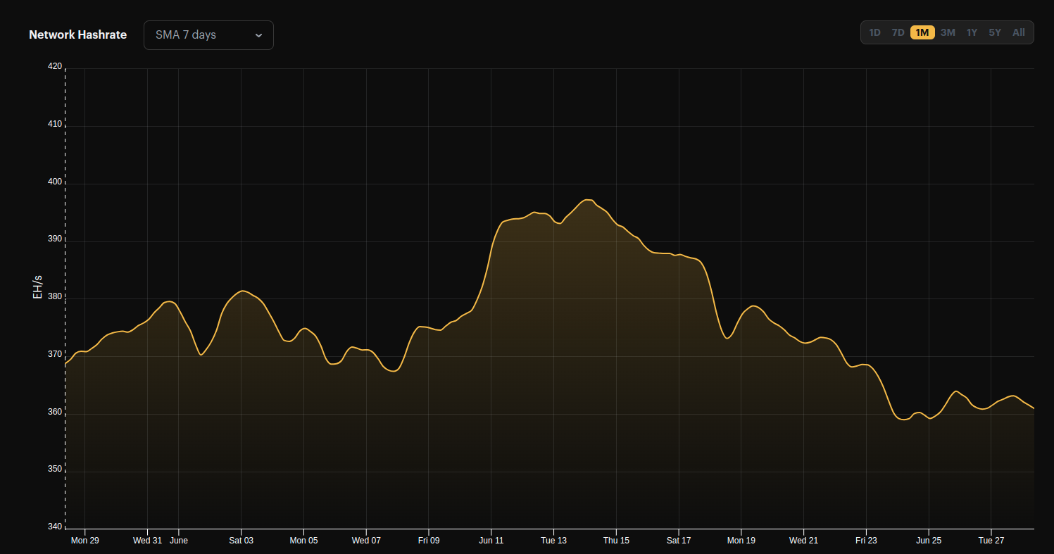 Following the decline in hashprice and the heatwave currently hitting Texas, network hashrate is down ~10% from the last difficulty adjustment.