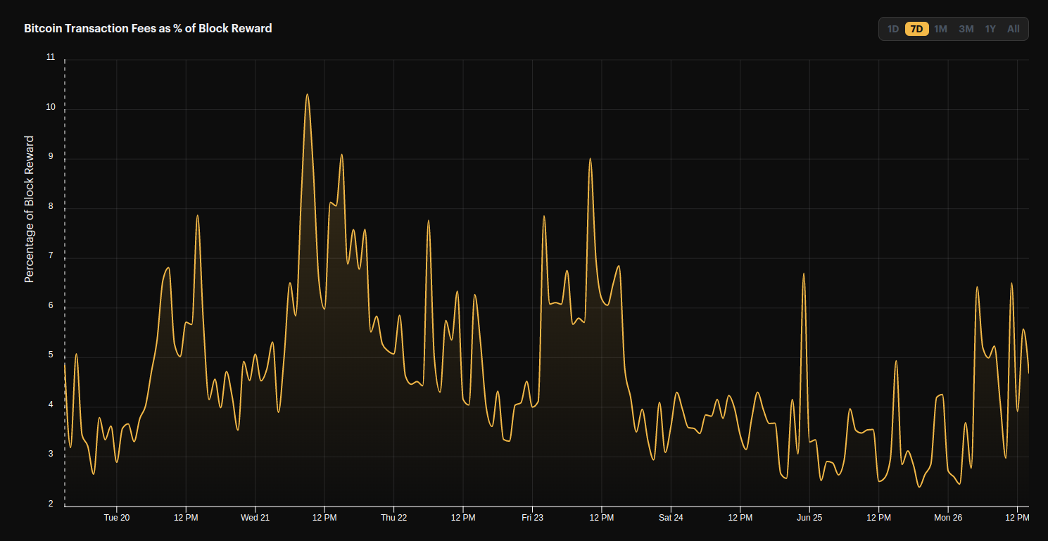 Over the last seven days fees have ranged from 2.39% (~6 sats/TH/s/Day) of the block reward up to 10.31% (34 sats/TH/s/Day).