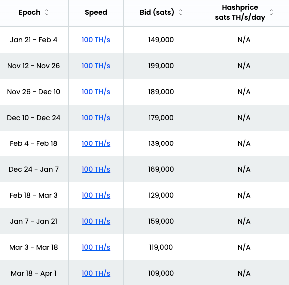 Place your bid on hashrate in the next 12 difficulty adjustments. These mining auctions close Sunday @ 18:30-20:00 US/Eastern time