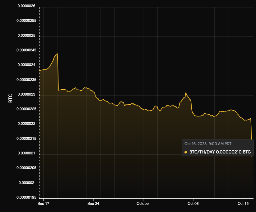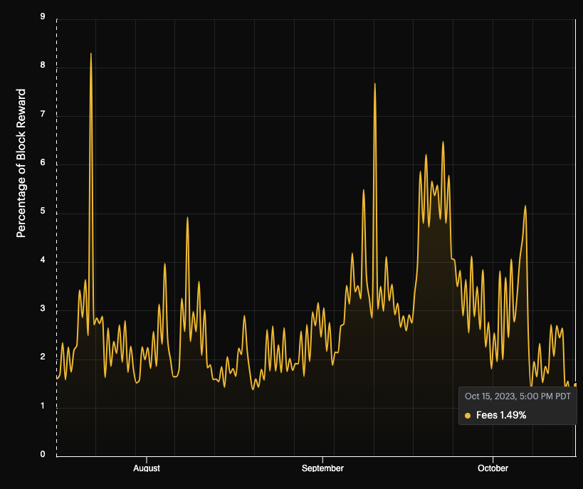 Oct 16th fees were 1.49% of the block reward with a hashprice of 210 sats/TH/s/day