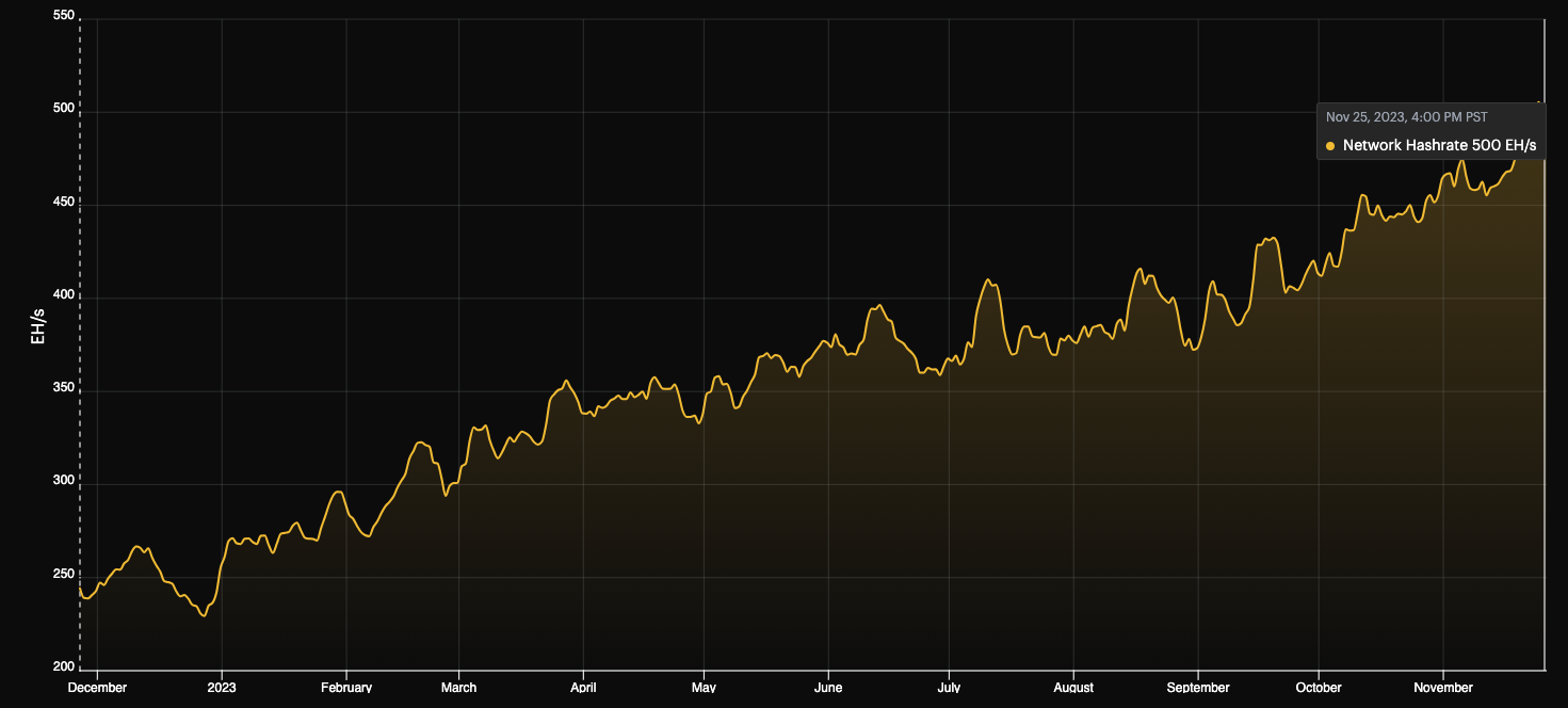 - Network Hashrate: ~500 EH/s