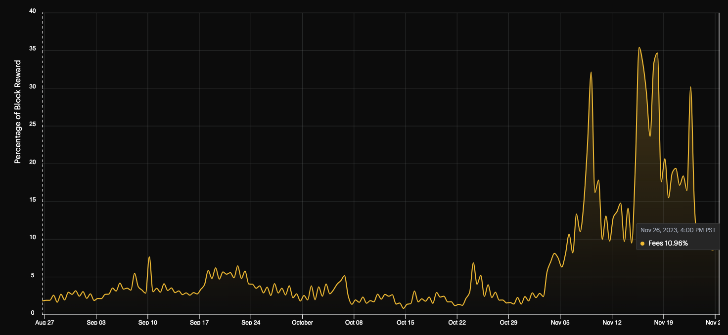 Bitcoin network difficulty is now 67.96 trillion (+5.07%) and also saw an all-time high over 500 EH/s. At the same time, transaction fees as a percentage of mining rewards also continue to reach new highs, in large part due to ordinals-related activity.