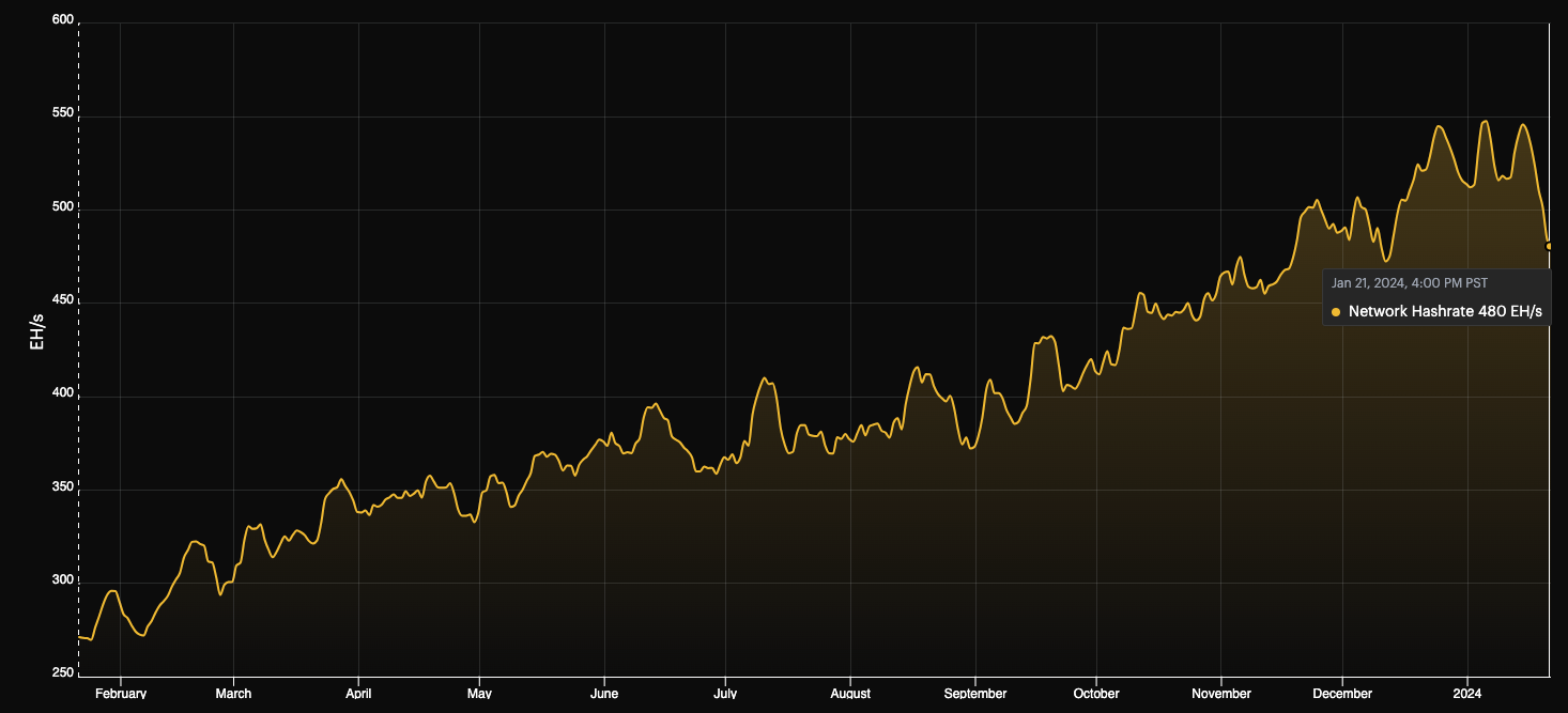 - Network Hashrate: ~480 EH/s