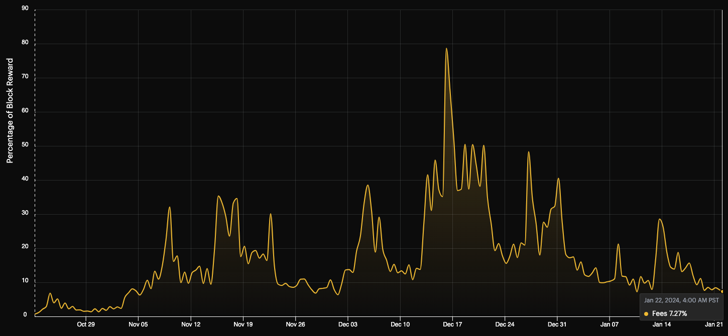 Jan 22nd fees were 7.27% of the block reward with a hashprice of 192 sats/TH/s/day.